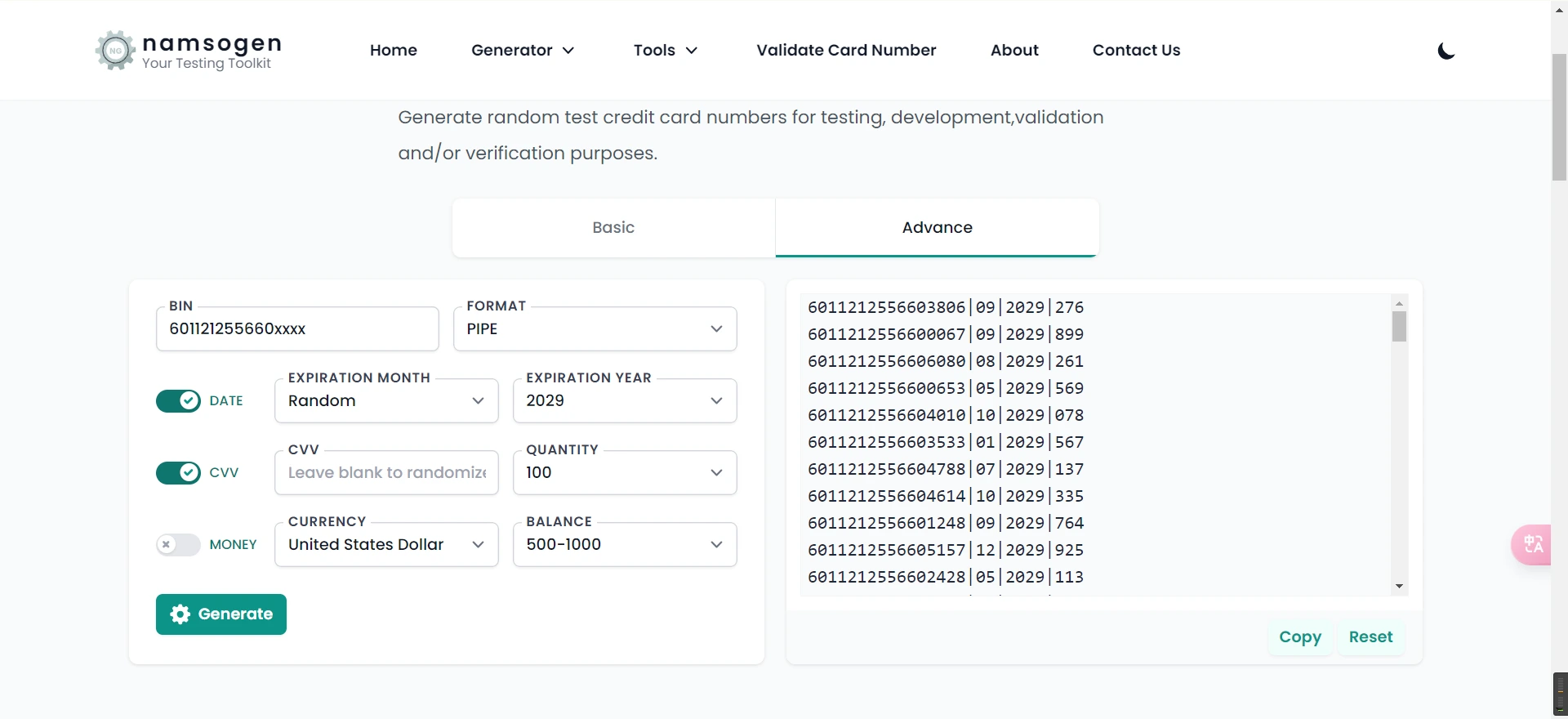 使用信用卡号生成网站 Namso-gen,在对应的卡段下生成一定数量的信用卡信息