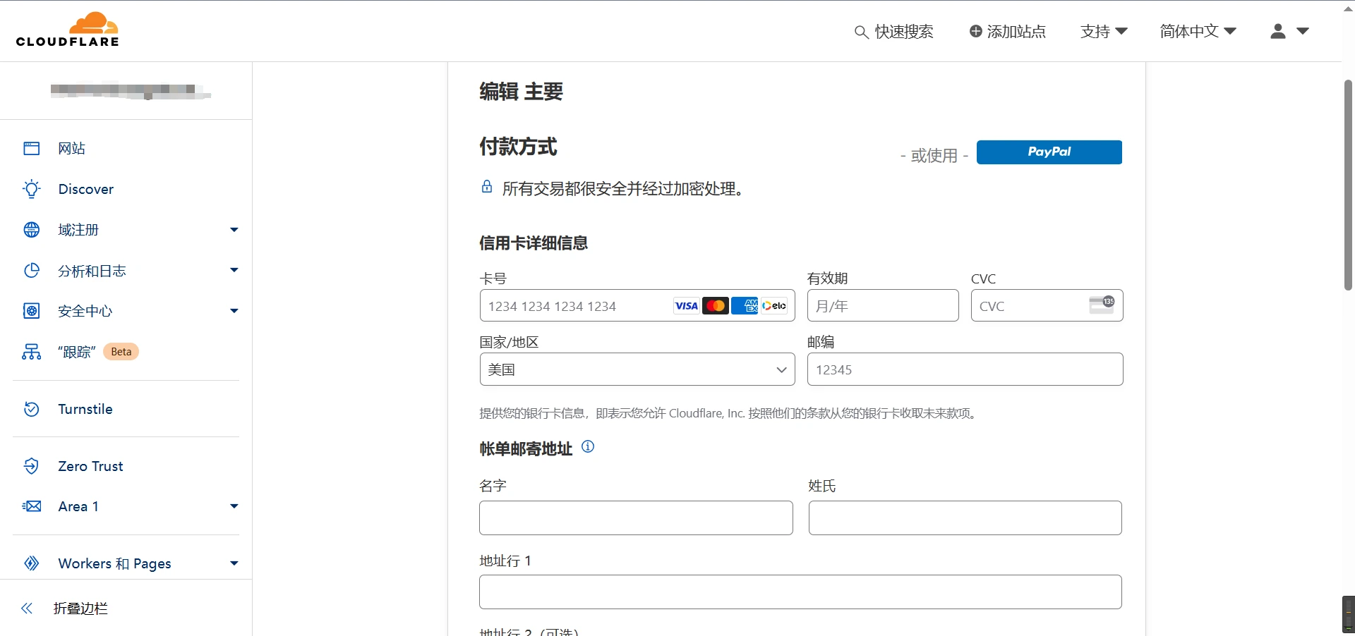 在 Cloudflare Dashboard 点击右上角的头像-->账单-->付款信息,添加付款方式。