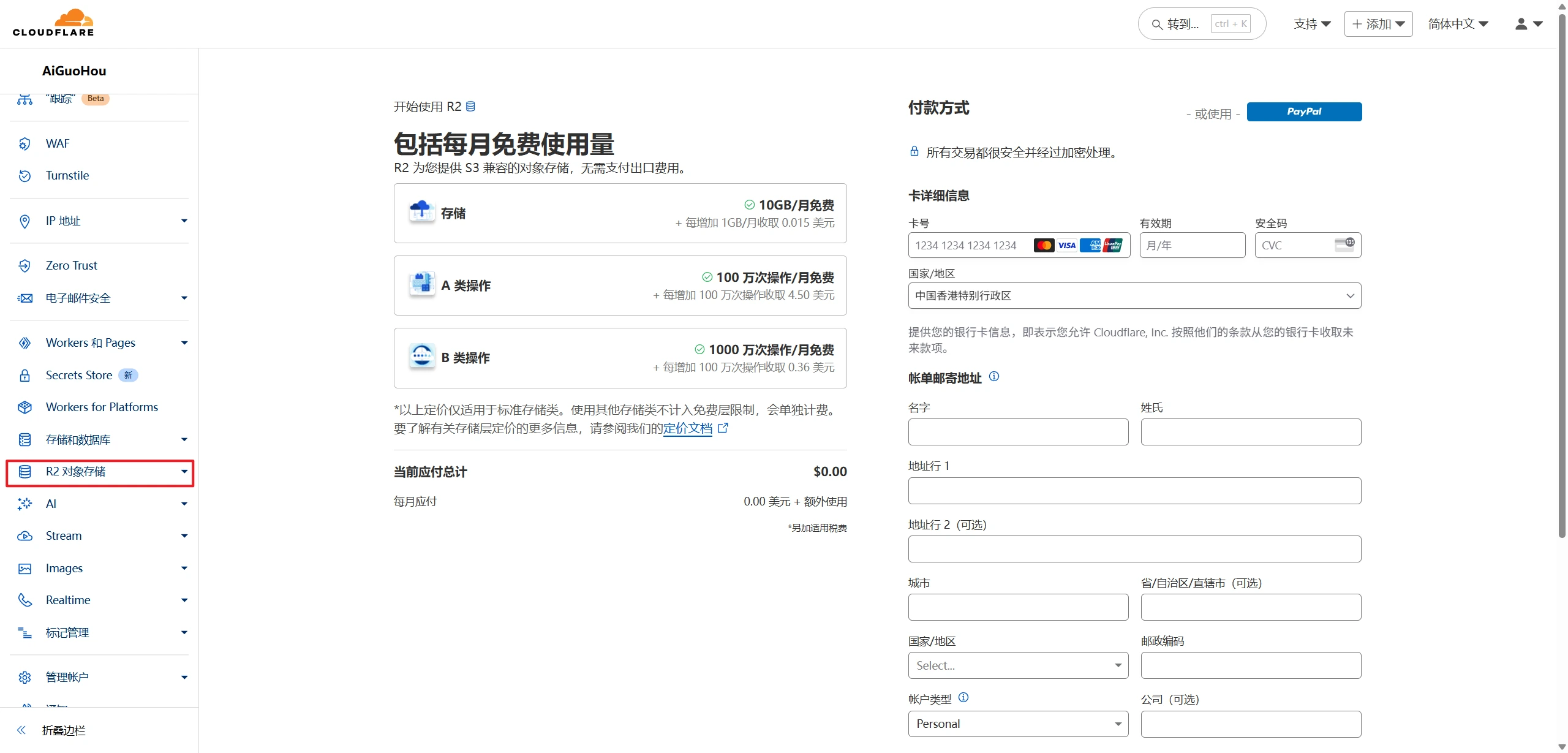 那么,你需要做的是,点击【R2对象存储】后,右侧出现按钮时,立马点击它。注意此时信用卡表单填写页面还没有出现。一直点击按钮直到自动跳转,此时,我们的R2就开通成功了。