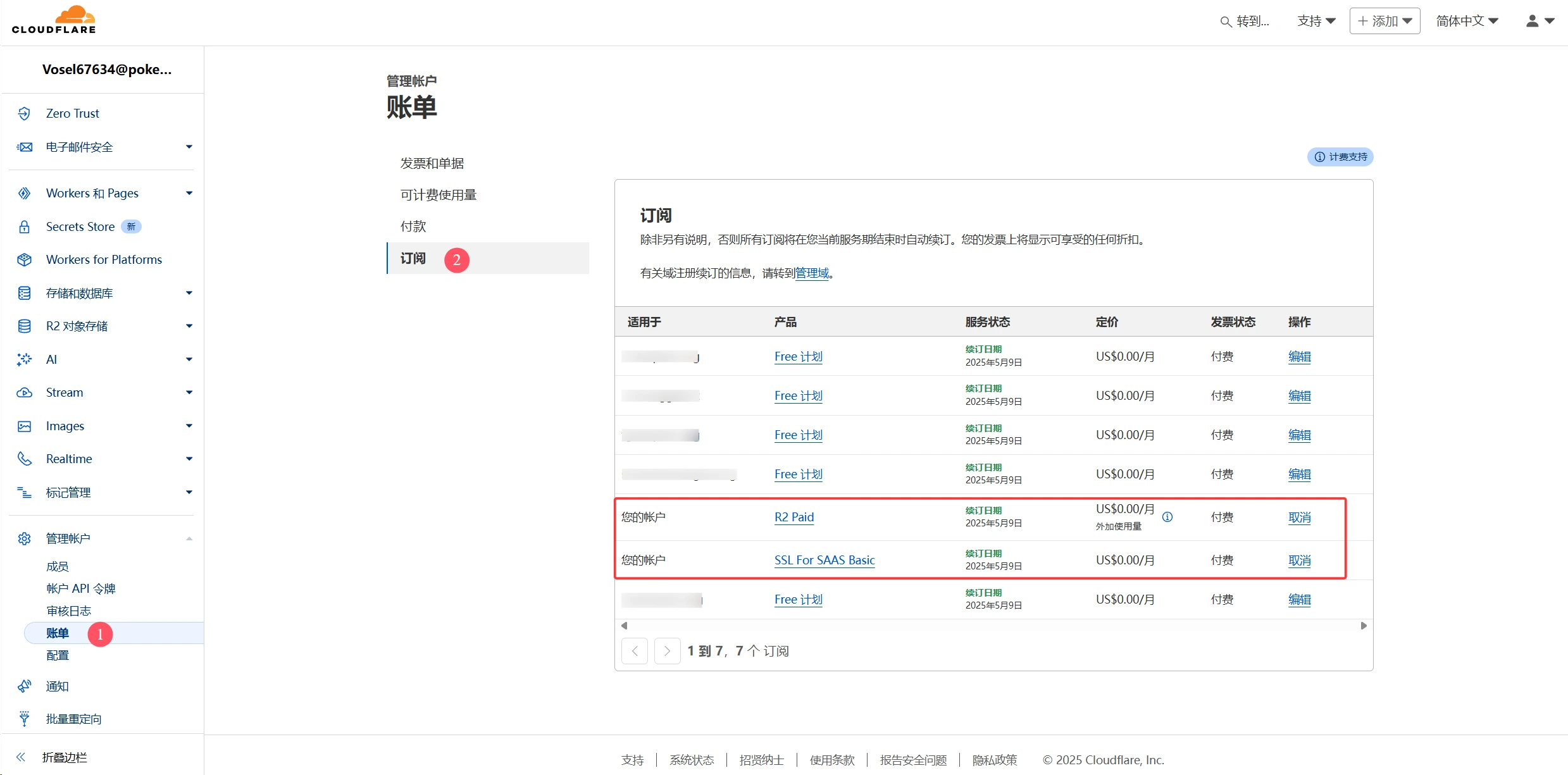 开通之后,到【管理账户】-【账单】-【订阅】,即可看见我们 R2 开通情况。